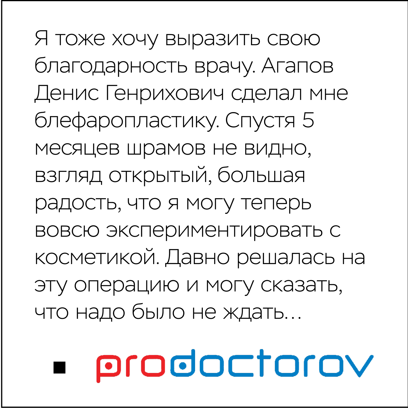 Я тоже хочу выразить свою благодарность врачу. Агапов Денис Генрихович сделал мне блефаропластику. Спустя 5 месяцев шрамов не видно, взгляд открытый, большая радость, что я могу теперь вовсю экспериментировать с косметикой. Давно решалась на эту операцию и могу сказать, что надо было не ждать...
