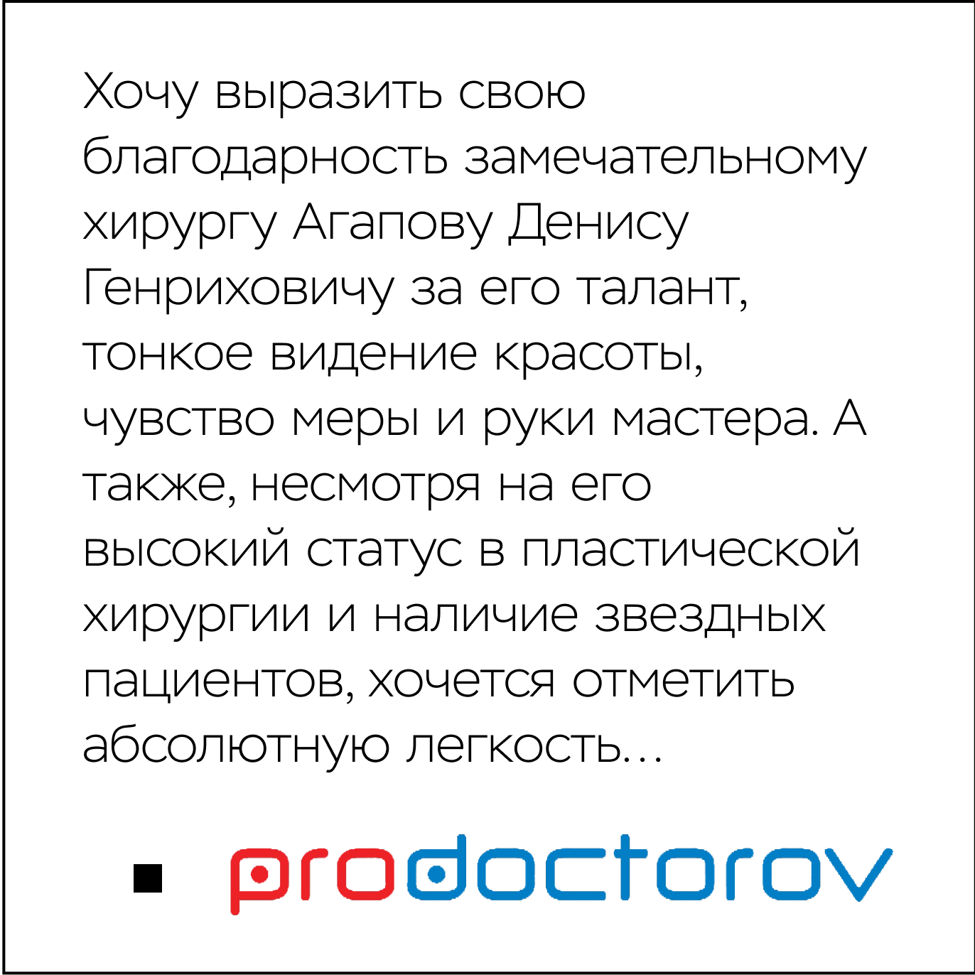 Хочу выразить свою благодарность замечательному хирургу Агапову Денису Генриховичу за его талант, тонкое видение красоты, чувство меры и руки мастера. А также, несмотря на его высокий статус в пластической хирургии и наличие звездных пациентов, хочется отметить абсолютную легкость...