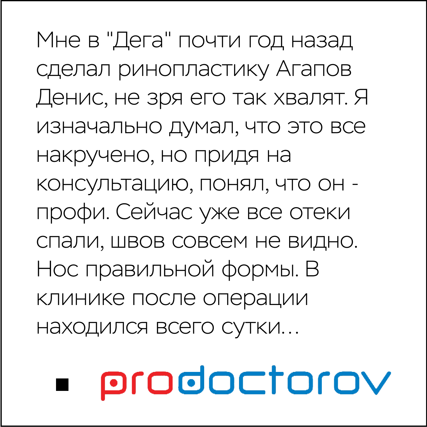 Мне в "Дега" почти год назад сделал ринопластику Агапов Денис, не зря его так хвалят. Я изначально думал, что это все накручено, но придя на консультацию, понял, что он - профи. Сейчас уже все отеки спали, швов совсем не видно. Нос правильной формы. В клинике после операции находился всего сутки...